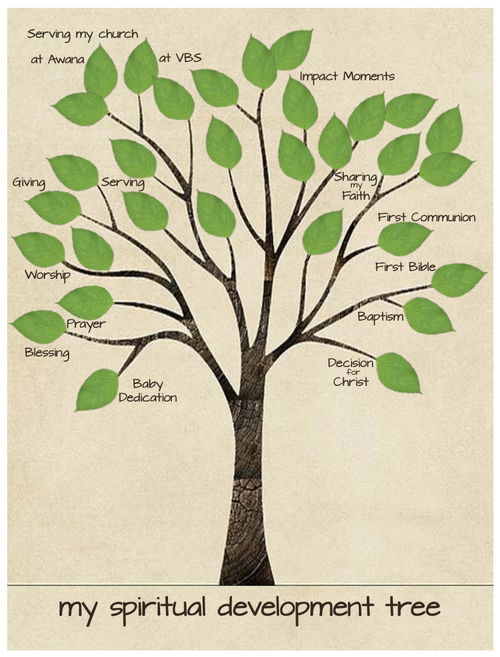 WHAT ELSE? You'll notice a tree growing beside the Faith Path in our visual. It represents a companion piece called My Spiritual Development Tree. It's the children’s version of Faith Path and provides a place to record their spiritual growth and history. If your child is little, you can record dates on the leaves until he or she is old enough to tuck it inside their own Bible for them to keep record on. Your child will see a rich history develop that is rooted in the firm foundation of the Faith Path you have led them on. Download a pdf here or pick one up in the Faith@home Center.