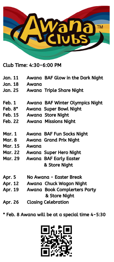 PLUS, a registration fee ($20 per child or $50 max per family), which covers Awana Club dues, Clubber awards, and all of the fun stuff we include on club nights. Scholarships are available.